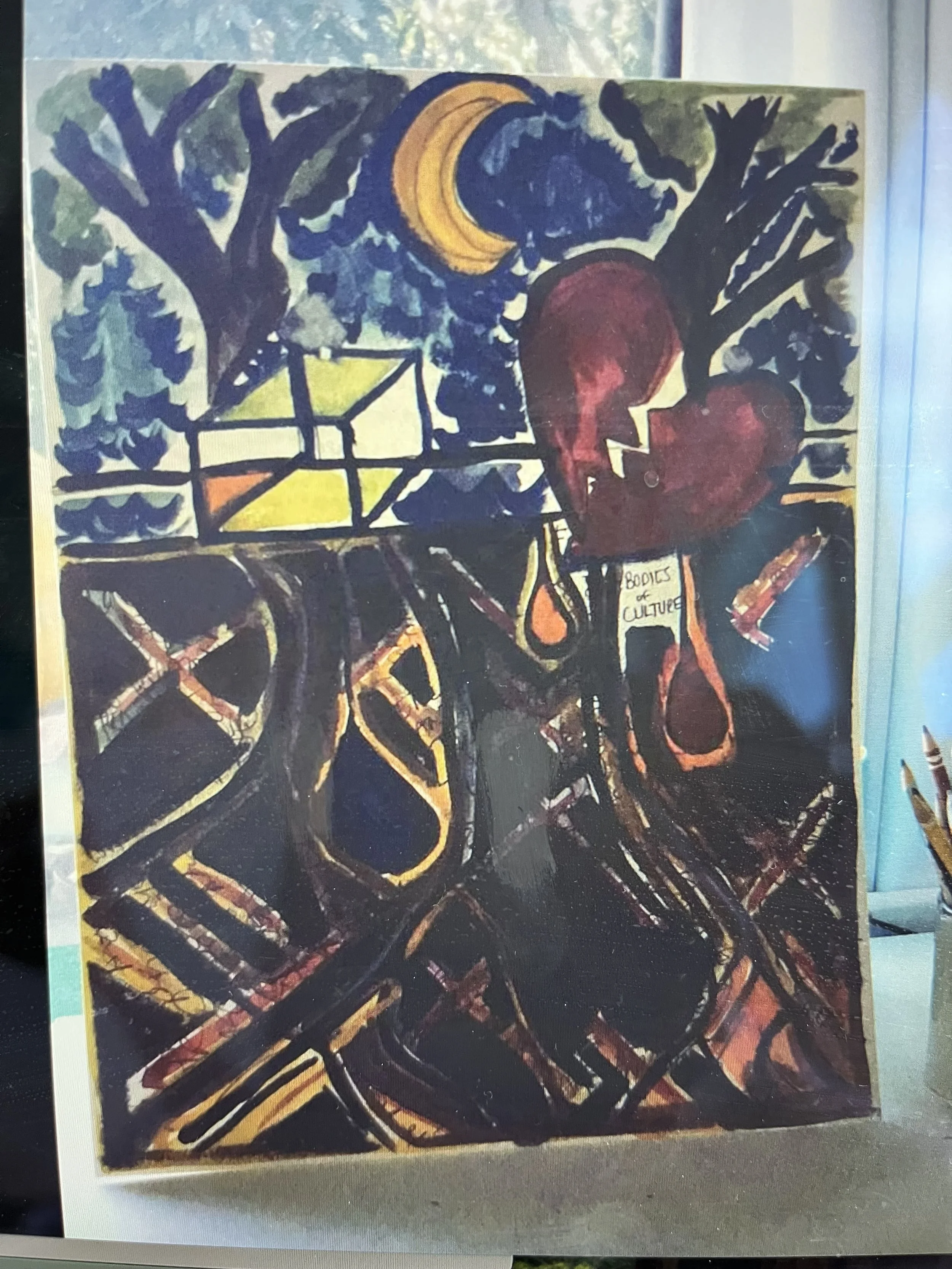 I have some old images of art from a long-ago Instagram account that I deleted when I completed this meditation course. The photo below shows two trees, a moon, a 3D box, and a broken heart. A large part of the painting is black and features the words “bodies of culture” written in what appears to be drops of blood flowing into the earth. There are two mugs beside the art, one containing pencils and the other containing markers. The one with markers has a broken handle, and the text says, “Feminist all day err day.”